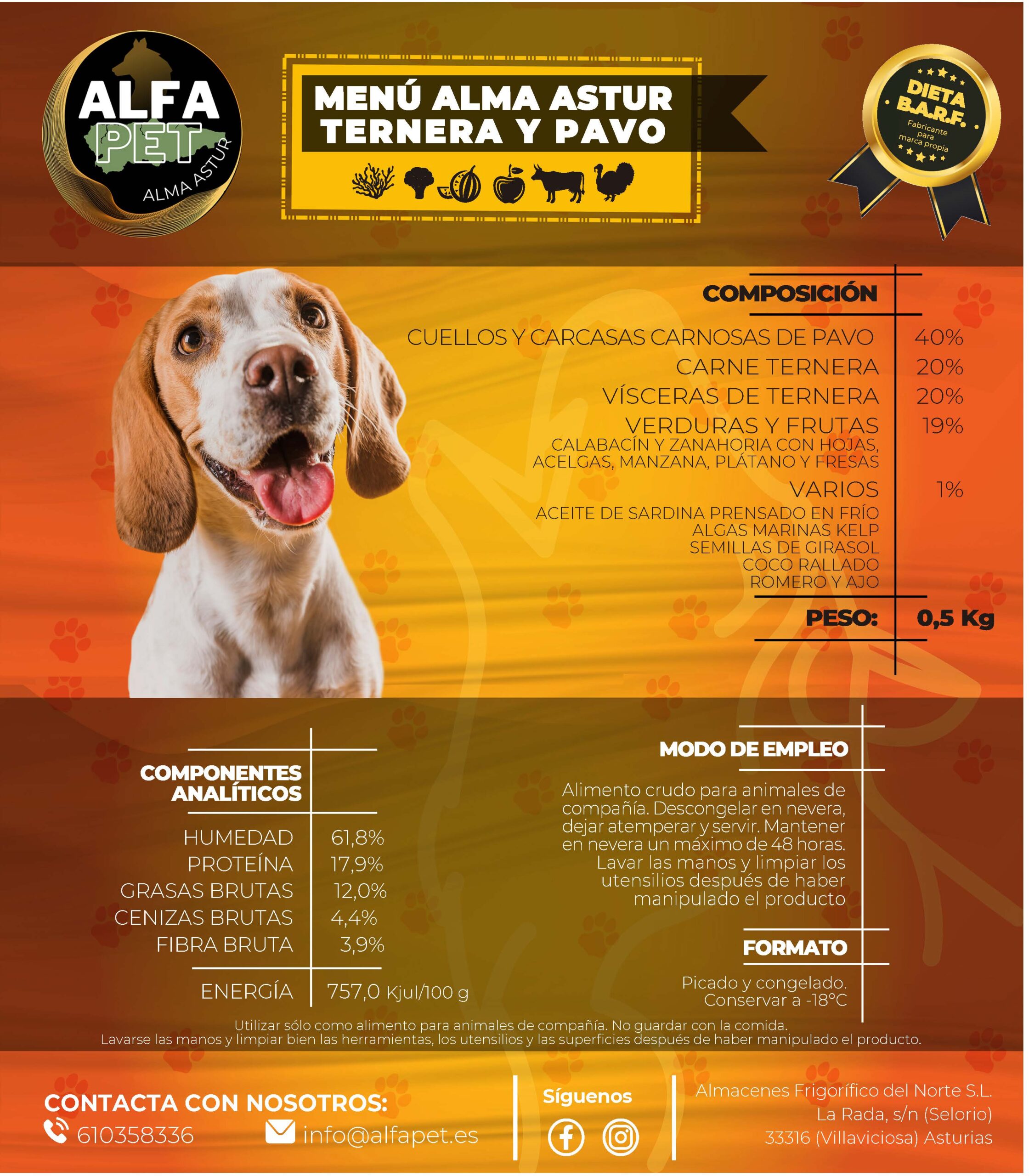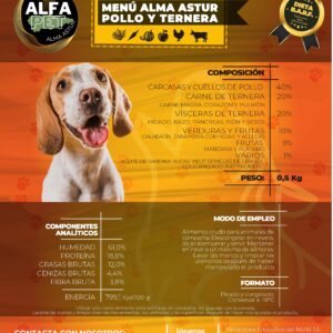 40% (cuellos y carcasas carnosas de pavo), 20% carne de ternera (carne magra, corazón y pulmón), 20% vísceras de ternera (hígado, bazo, páncreas, riñón y sesos), 10% verduras (calabacín, zanahoria con hojas y acelgas), 9% frutas (manzana y plátanos), 1% (aceite de salmón prensado en frío, algas marinas kelp, coco rallado, semillas de girasol, romero y ajo).