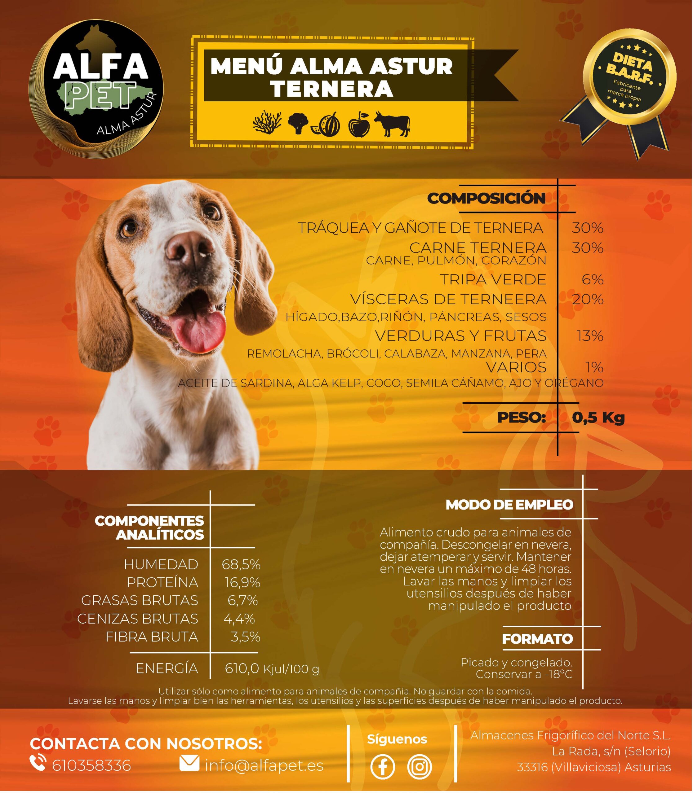 30% (tráquea y gañote de ternera), 30% carne de ternera (carne, pulmón y corazón), 6% tripa verde, 13 % verduras y frutas (remolacha, brócoli, calabaza, manzana, pera ), 20% vísceras de ternera (hígado, bazo, riñón, páncreas y sesos), 1% (aceite de sardina prensada en frío, algas marinas kelp, coco rallado, semillas de cáñamo, ajo y orégano).